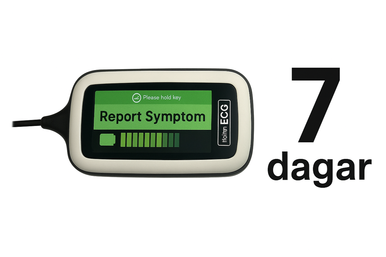 Med sju dagars kontinuerlig hjärtövervakning får du goda möjligheter att upptäcka oregelbunden hjärtrytm som inte fångas med kortare mätningar. Tjänsten inkluderar AI-analys, kardiologens utlåtande, detaljerad rapport samt hemleverans och support.